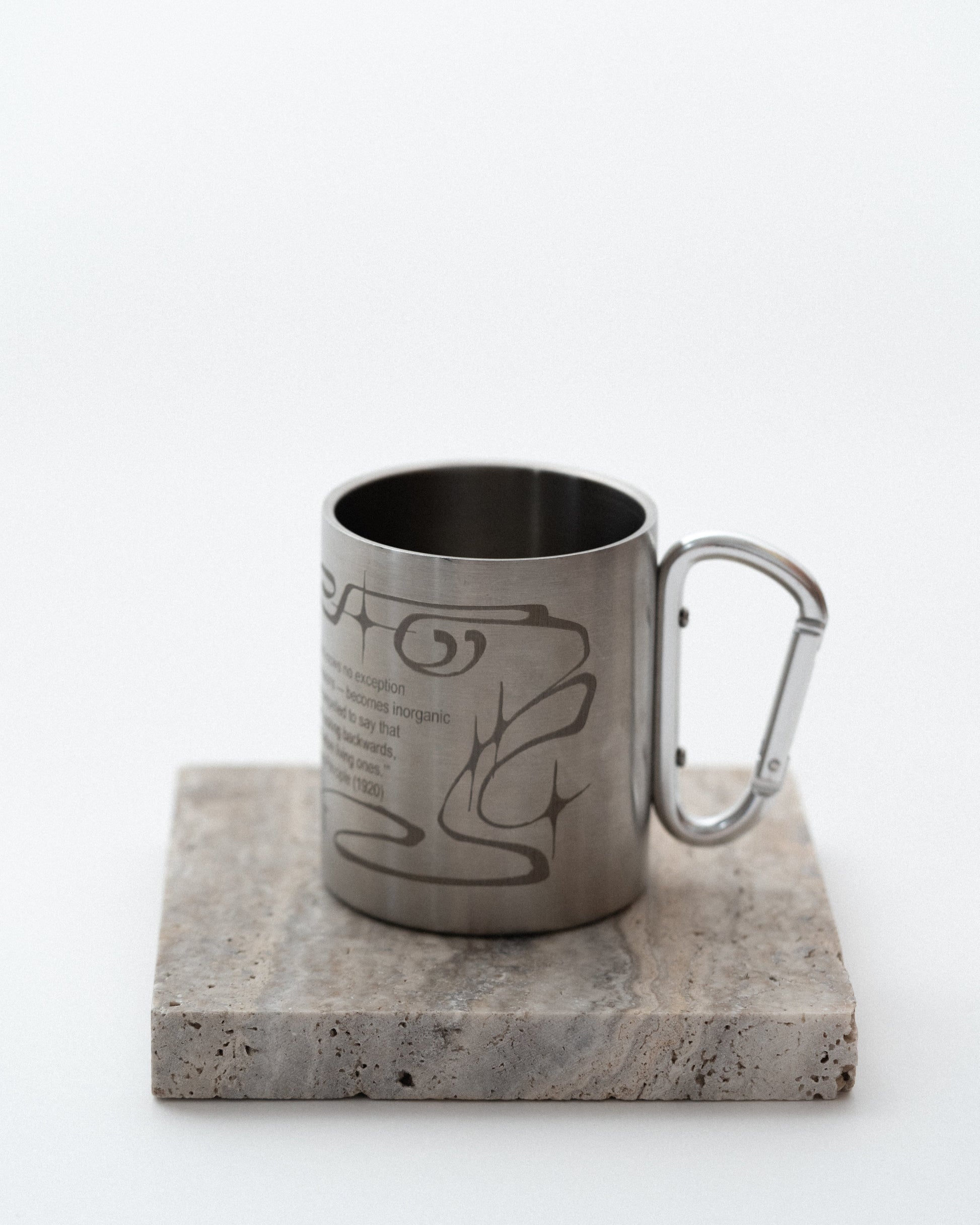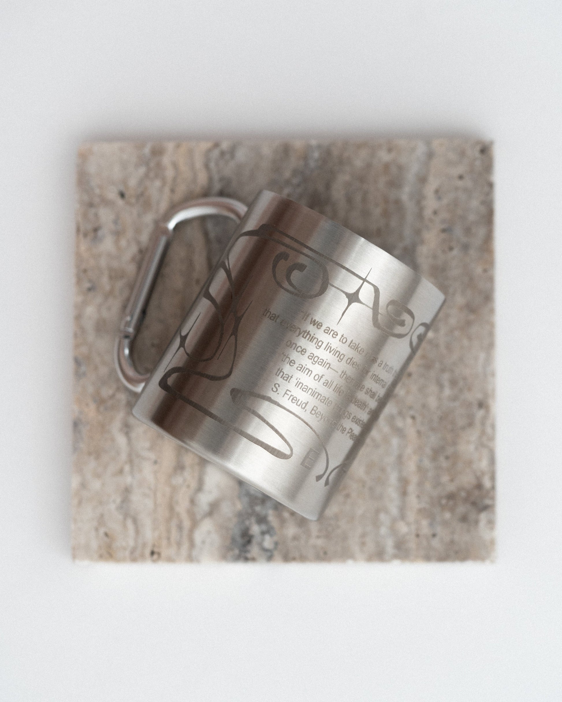 The Thanatos Cup is crafted from food-grade stainless steel with a double wall to retain heat. Its handle is a functional carabiner, making it easy to attach to a backpack on hikes and travels. The surface is decorated with an Art Nouveau-inspired ornament and engraved with a Freud quote: