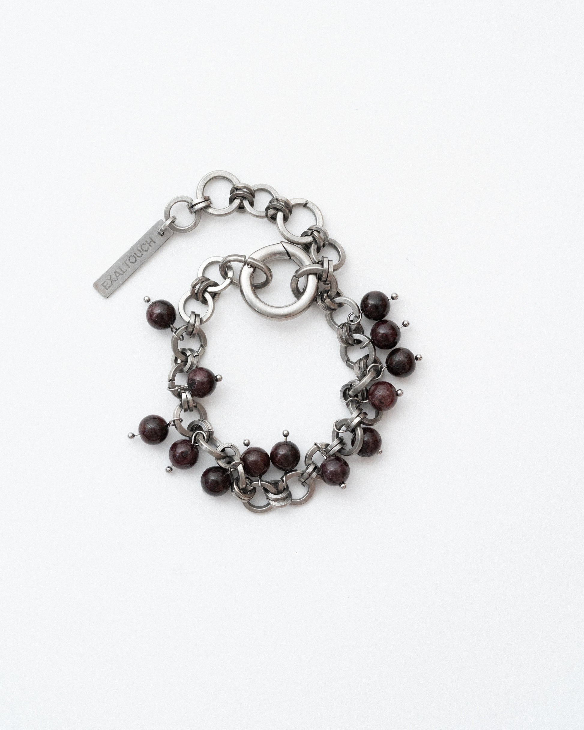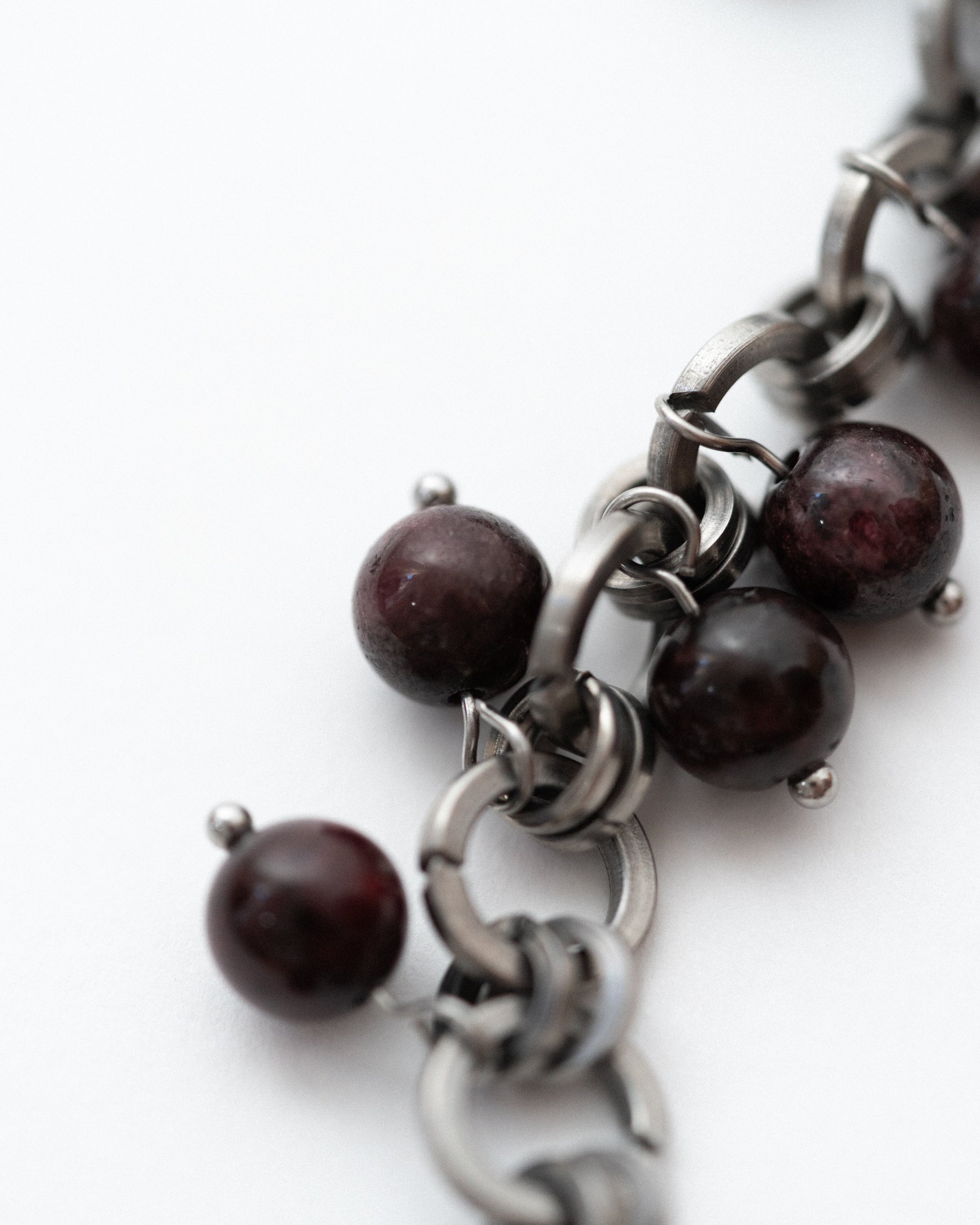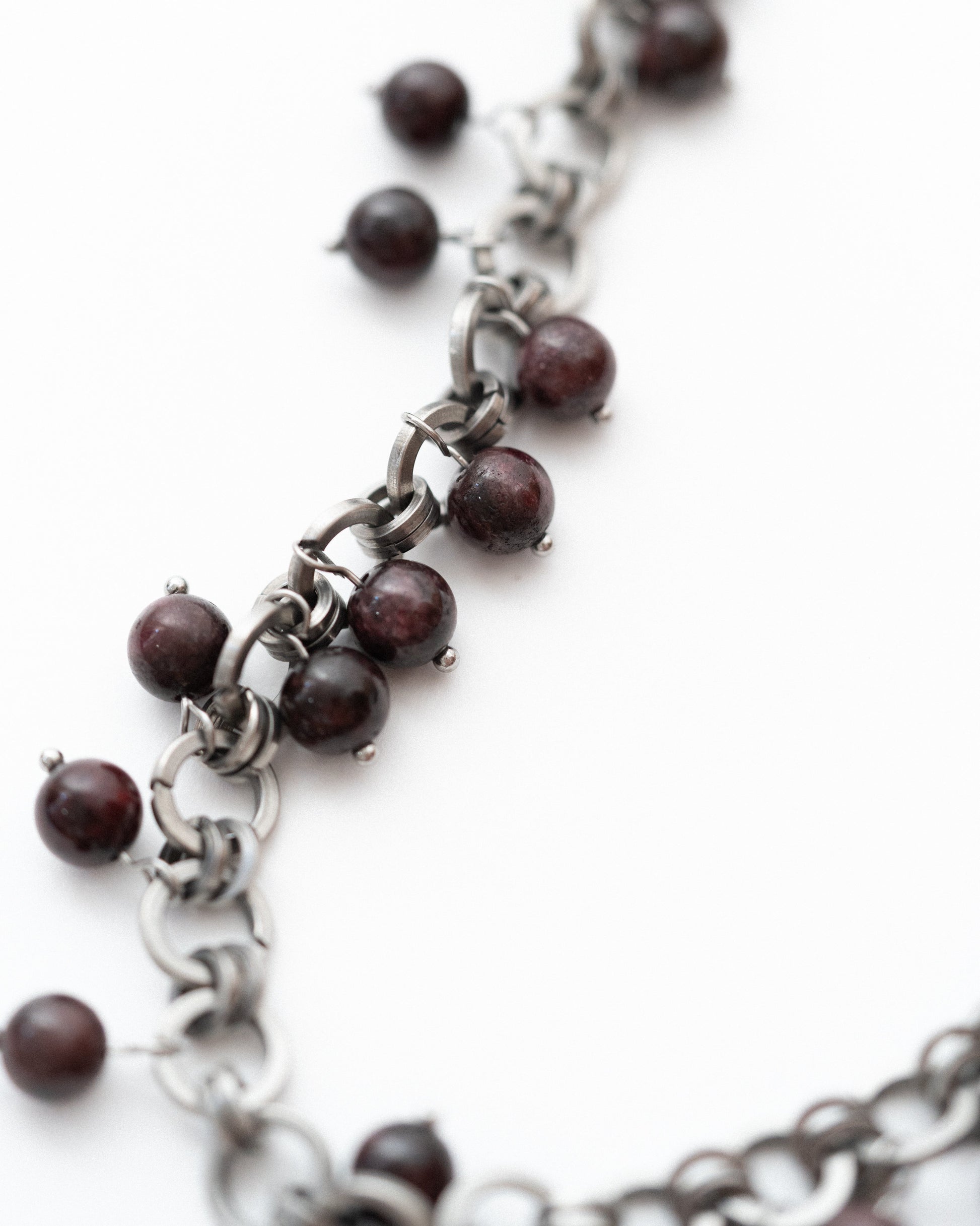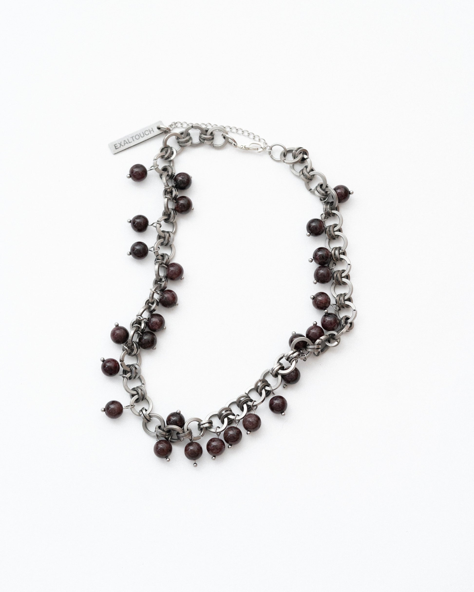 Hand-assembled from industrial stainless-steel rings, the chain is densely dotted with natural stones—aventurine, obsidian, Picasso jasper, garnet, hematite—left free to sway so the necklace moves like water with every step. Unisex.