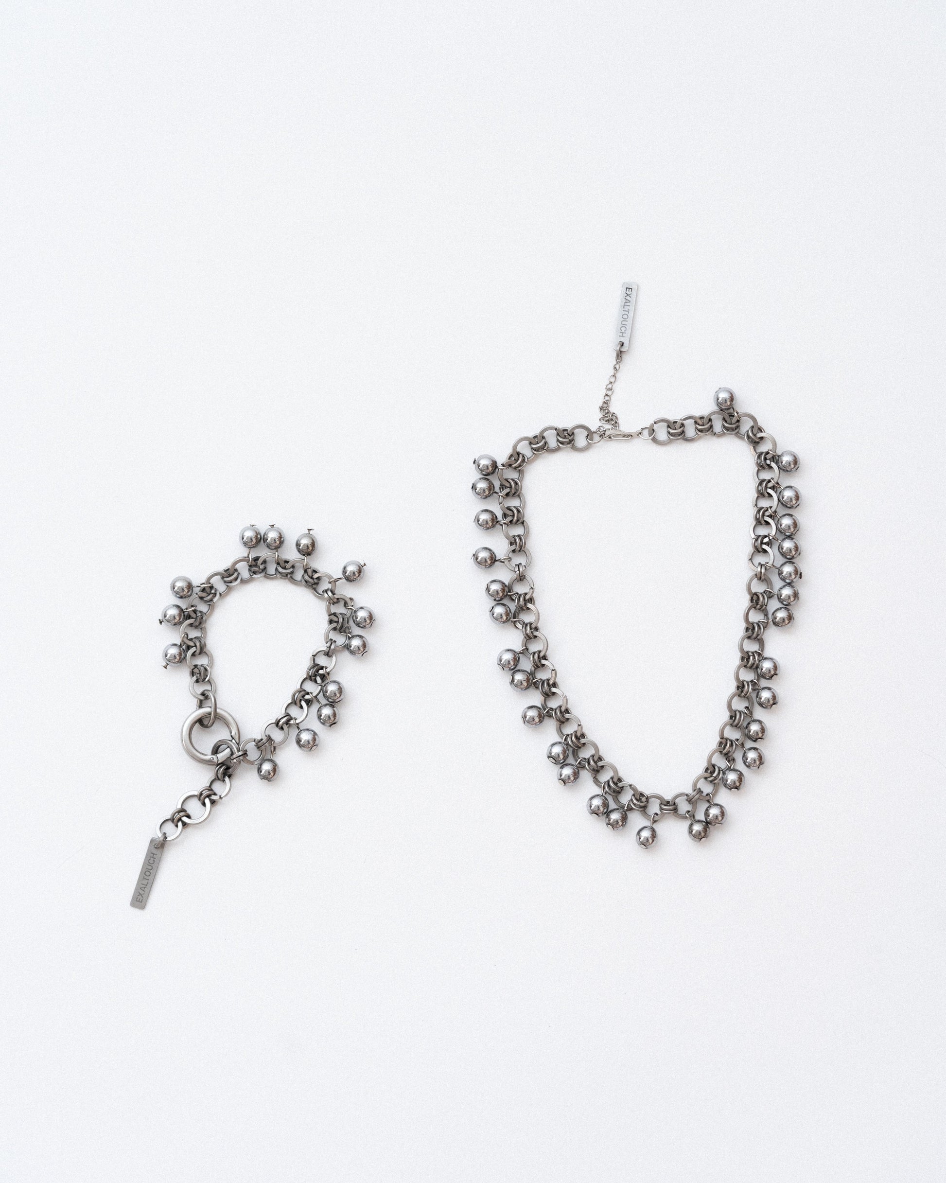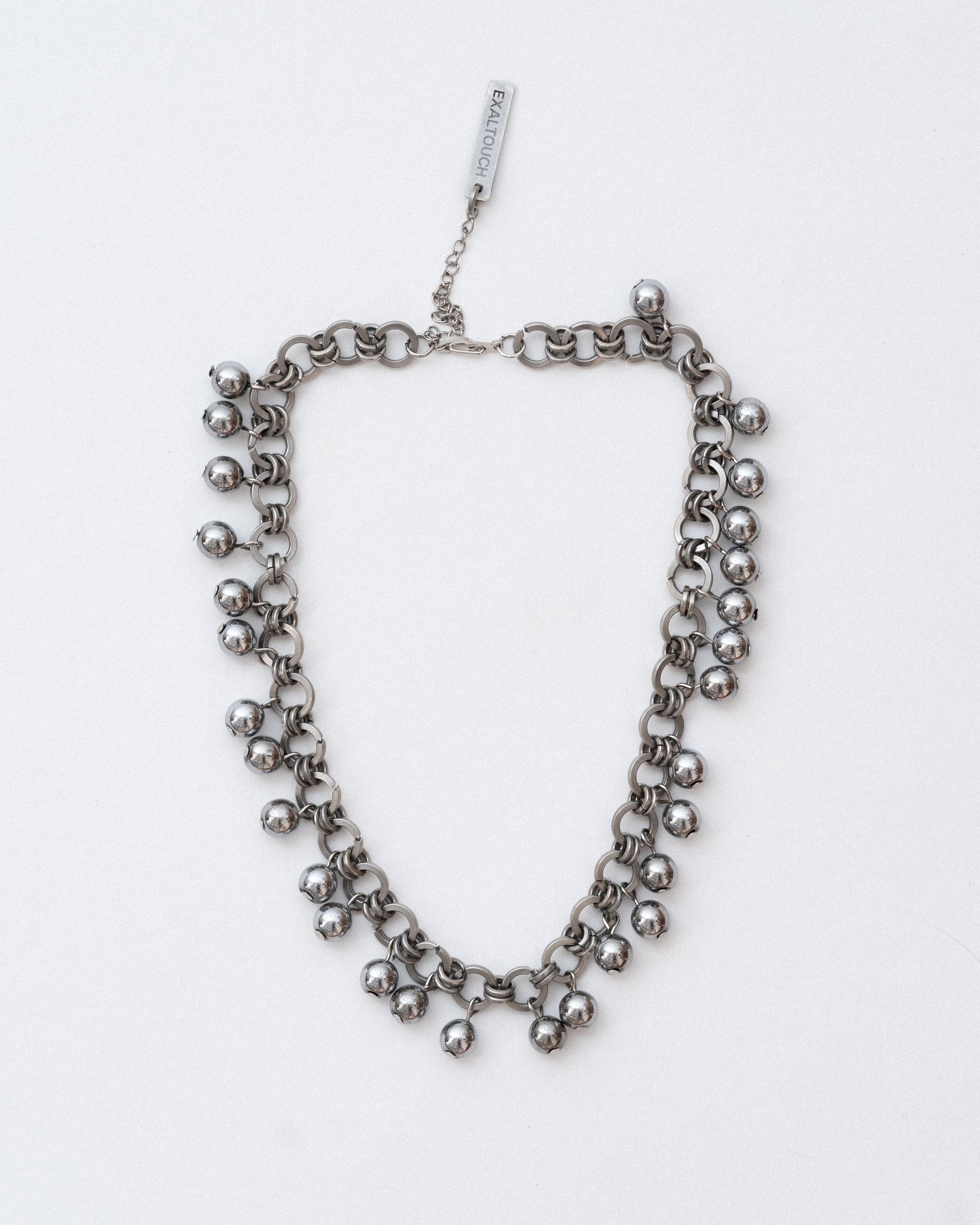 Hand-assembled from industrial stainless-steel rings, the chain is densely dotted with natural stones — aventurine, obsidian, Picasso jasper, garnet, hematite — left free to sway so the necklace moves like water with every step. Unisex.