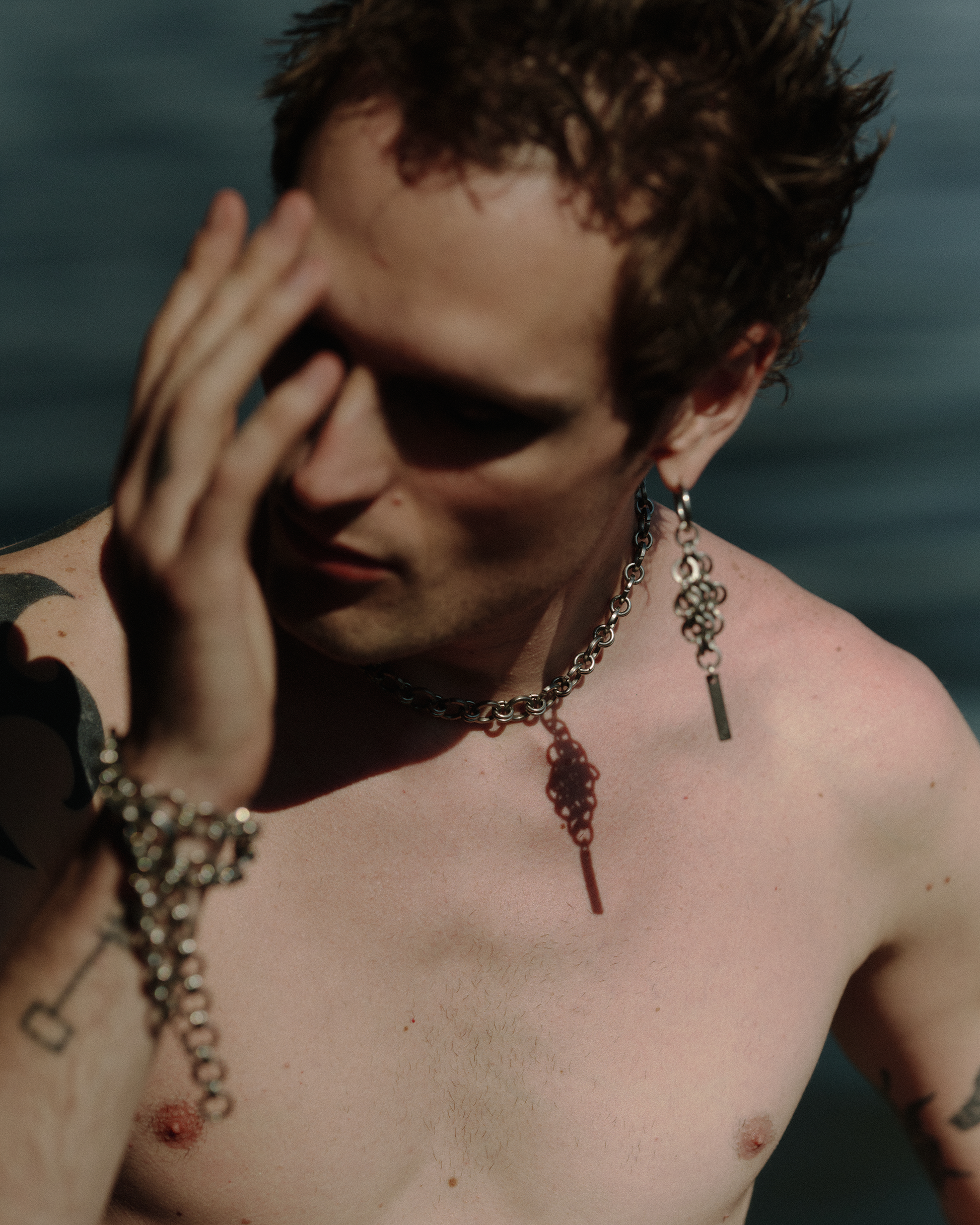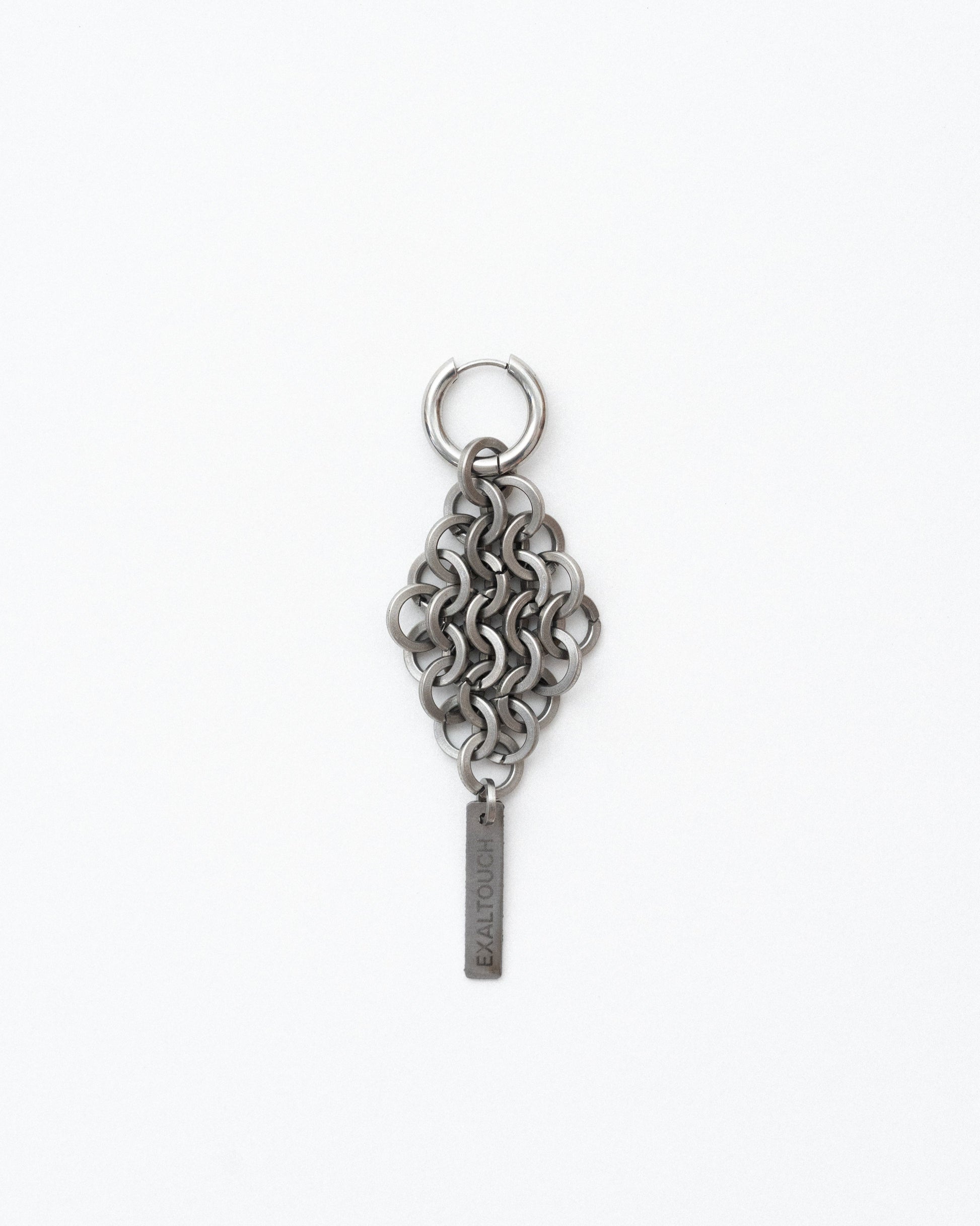 Rhombos carries a chainmail texture and sharp geometry — a blade between protection and openness. The diamond-shaped pendant is handwoven from our industrial stainless-steel rings, while the circular ear base is made from a hypoallergenic medical alloy.