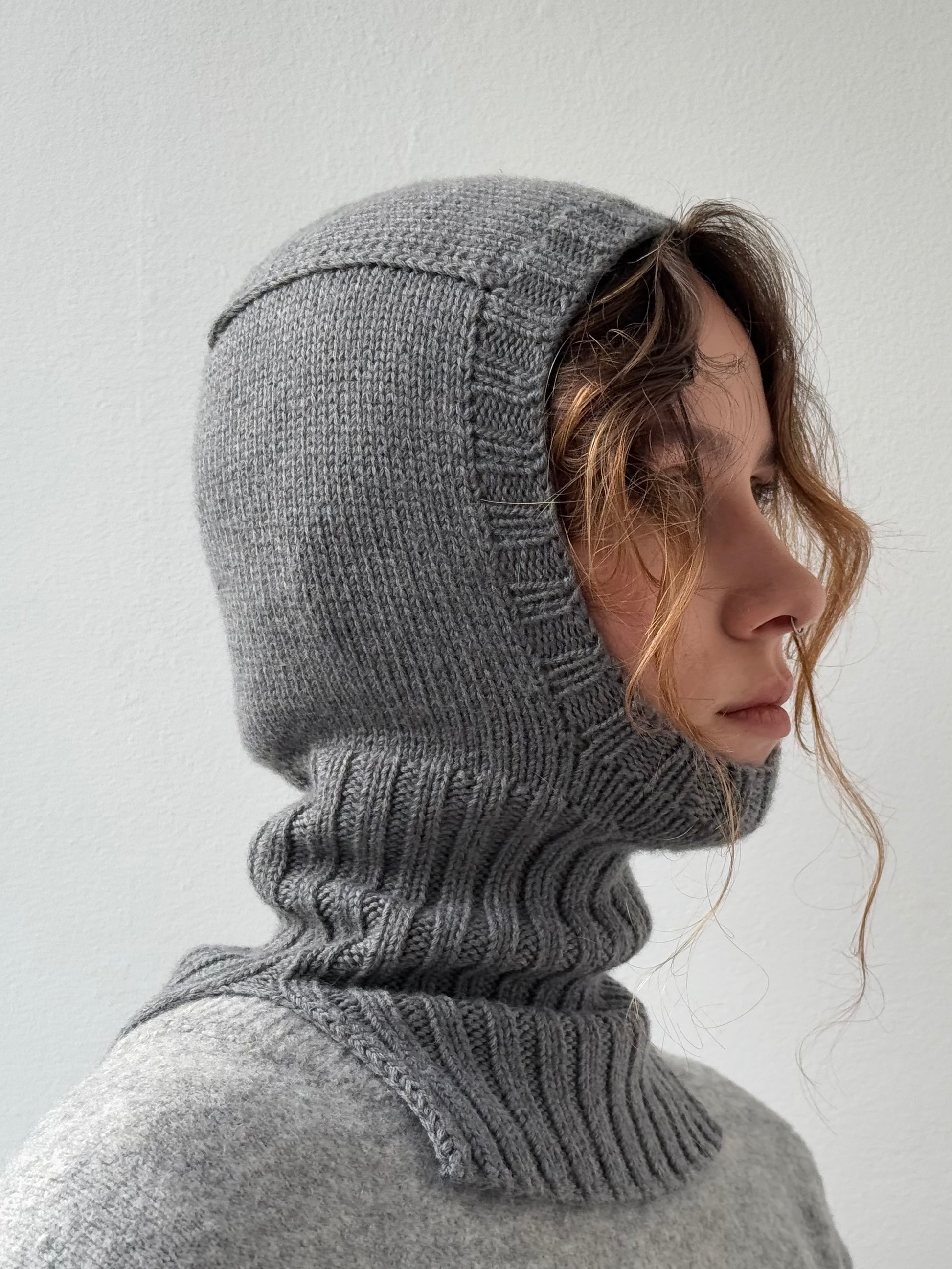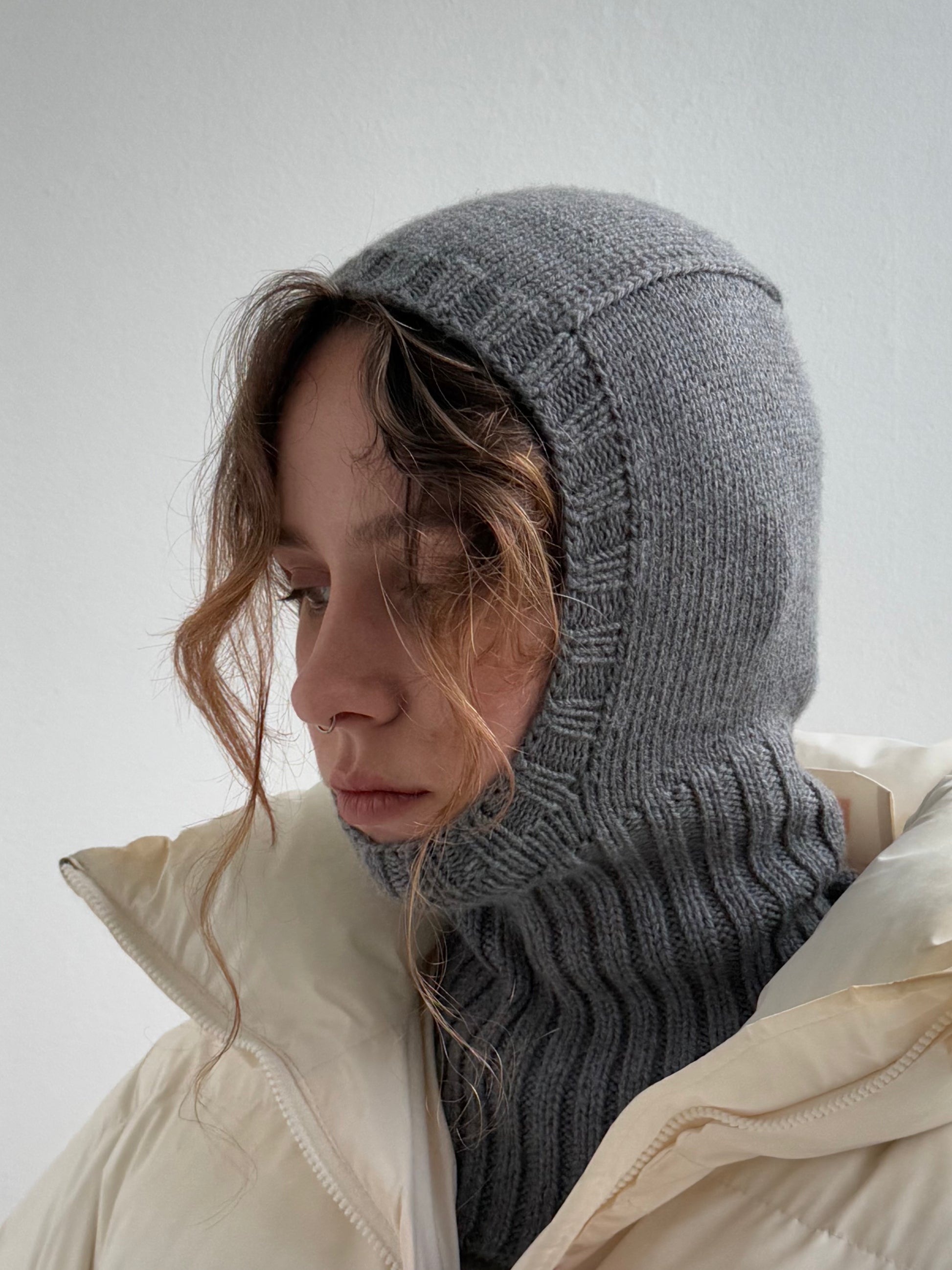 Облягаючий силует переходить від шиї у в’язану манішку, яка закриває груди, захищає від холоду та унеможливлює продування між балаклавою й верхнім одягом.