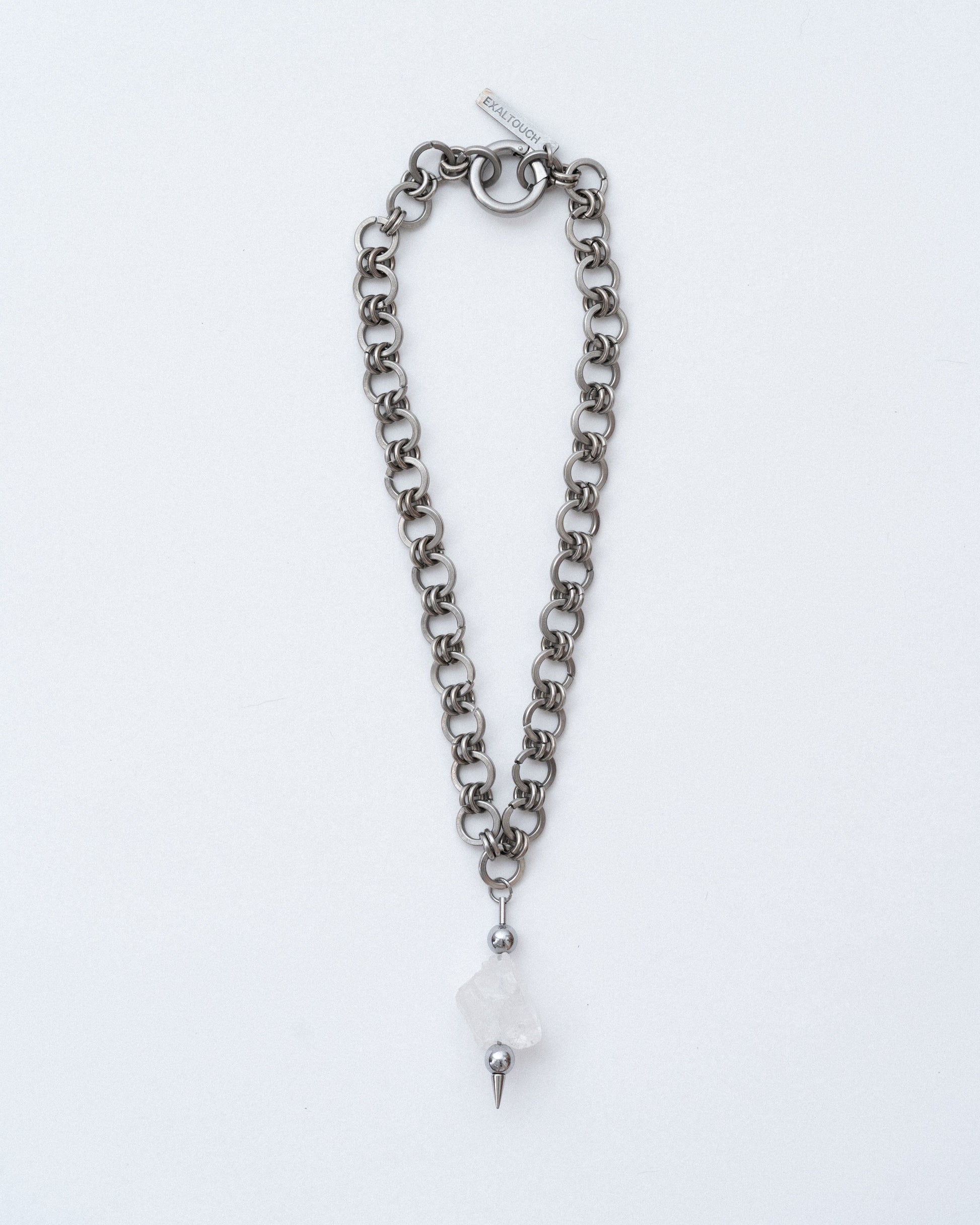 Намисто зібране вручну з нержавіючої сталі та натурального каміння, має ланцюжок та кулон з необробленим мінералом. Доступне у двох довжинах: 45 см і 60 см, а також у п’яти варіантах каміння: лабрадорит, рожевий кварц, сонячний камінь, гірський кришталь та раух-топаз. Завдяки карабіну довжина регулюється, забезпечуючи комфортну посадку.